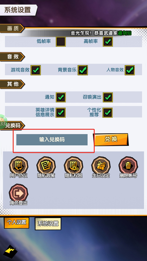 2、进入系统设置界面,输入兑换码即可完成兑换