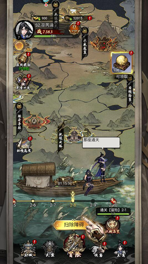 3、获得侠客后点击冒险,然后开始扫除障碍之旅。
