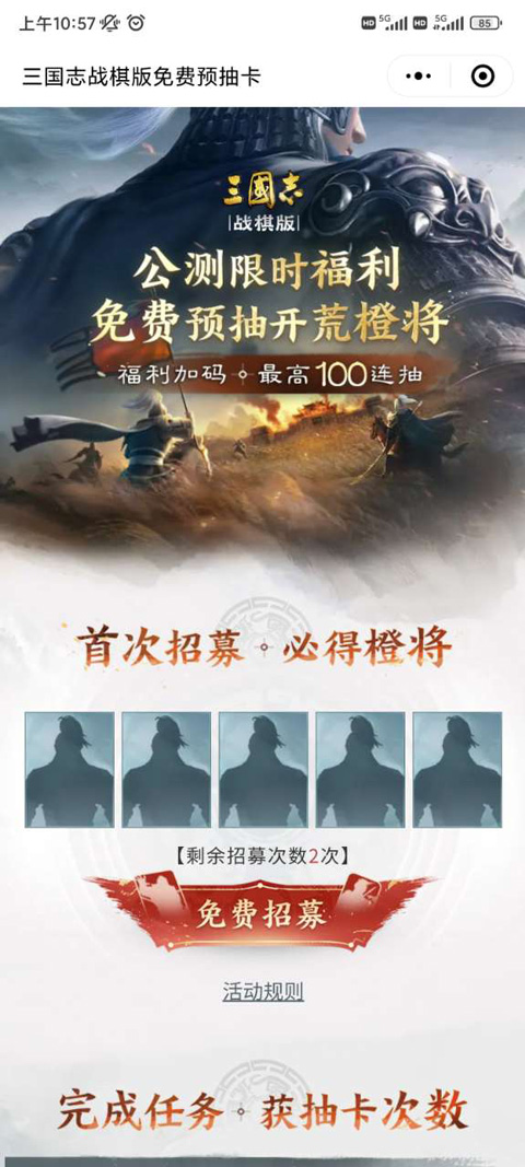 通过微信小程序或官方公众号参与预约抽卡活动,每日登录即可免费进行抽卡,有机会获得橙色与紫色品质武将。活动期间所获武将可在游戏正式开测后直接兑换使用。