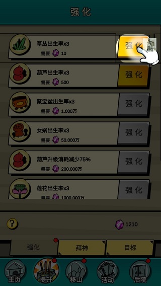 此外,游戏中获得的宝石不仅能用于场景升级,还能在“提升”栏目中强化各类设施,从而显著提升子孙生成效率。