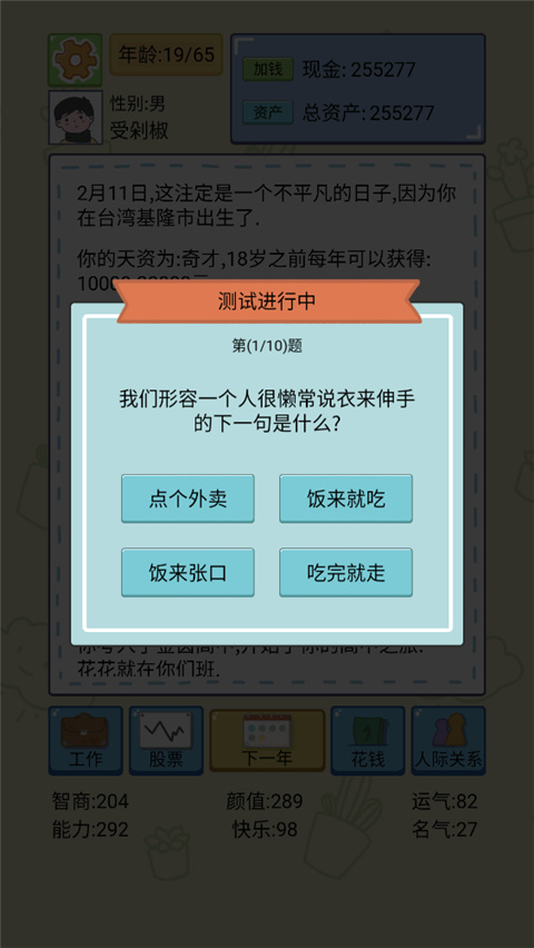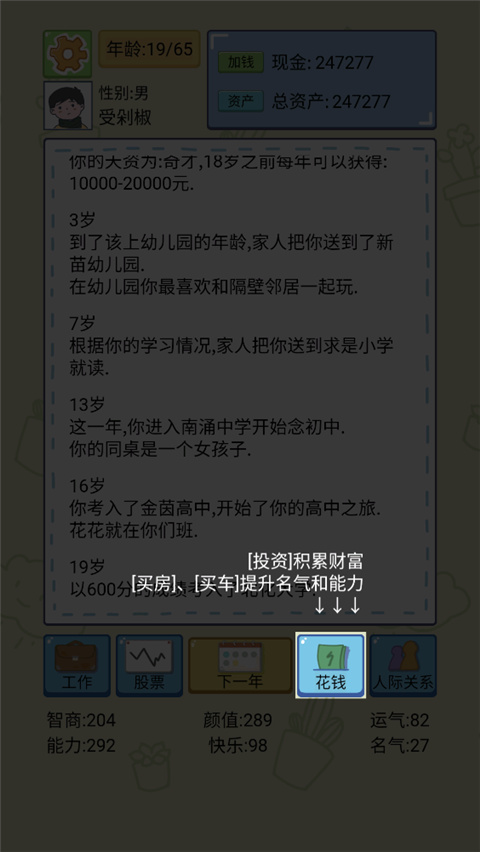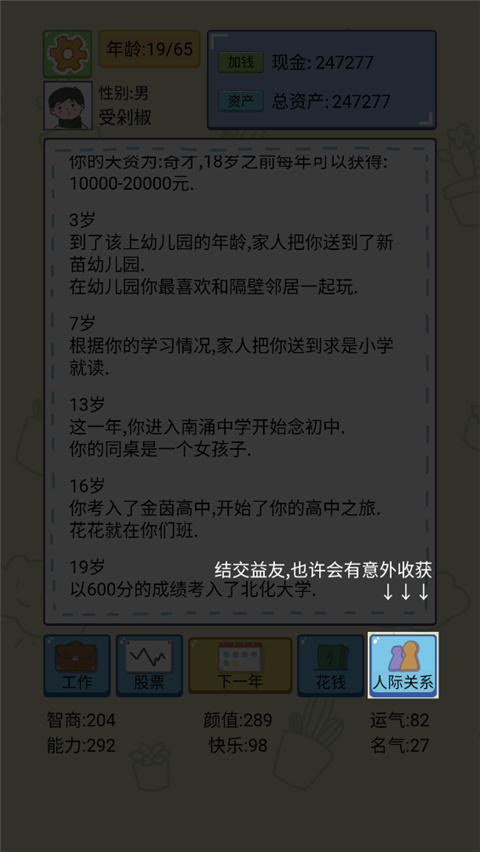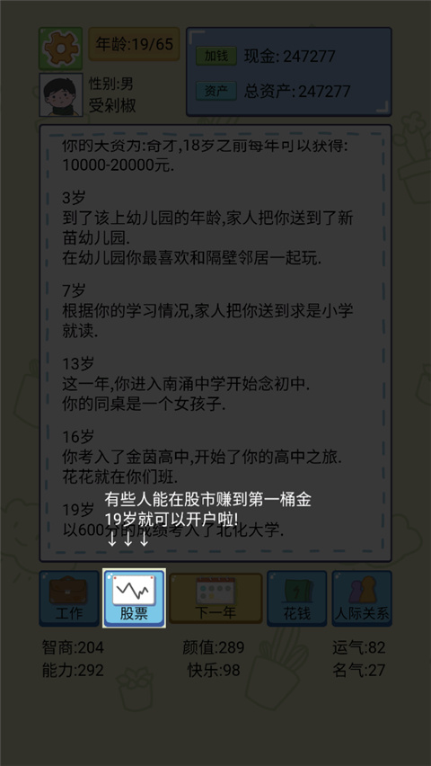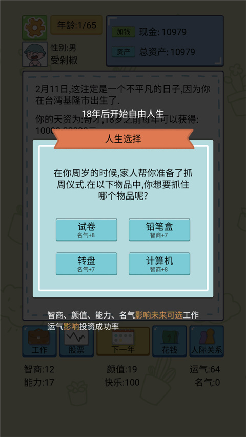 3、首次面临人生抉择时,需分配初始属性,包括智商、颜值、能力与名气,这些数值将深刻影响未来的职业机会、人际关系以及投资成功率。