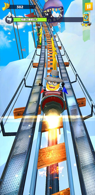 1、小伙伴们在游戏中会看见很多跟自己一样的小黄人在路上捣乱,这些小黄人会出现在游戏道路的右边跑道上面去,中间障碍等,你需要的第一感觉不是去躲避他们。你需要操控你的小黄人去撞开他们来获得”卑鄙的奖励“