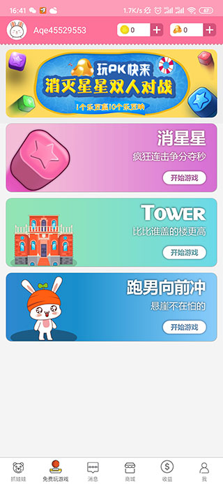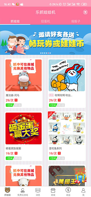 然后会看到抓娃娃、免费玩游戏、消息、商城、收益、我的六个板块,点击抓娃娃板块会看到这里有很多的娃娃可抓: