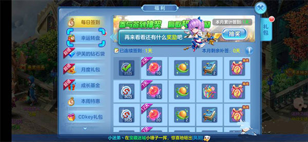 4、福利系统丰富多样,除每日签到外,还有幸运转盘等你参与,记得每天上线领取奖励。