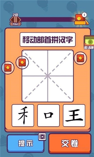 汉字高手红包版官方正版是一款休闲汉字拼字游戏,玩家通过加一笔或移动偏旁部首组成新字,完成多样关卡挑战,在闯关中重新认识汉字,发现其丰富的构成方式与趣味。