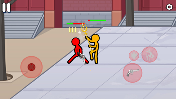 1、玩家在游戏中操控一个火柴人,利用简单的横版摇杆操作操控火柴人进行热血格斗。