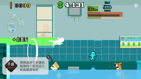 作为一款跑酷游戏,猫咪在奔跑过程中会遇到狗、墙壁和沟壑等障碍。尽管这些元素较为常见,但本作对操作精度要求较高:猫咪的跳跃高度与落点判定存在一定难度,稍有不慎就可能撞墙或坠落,挑战性十足。