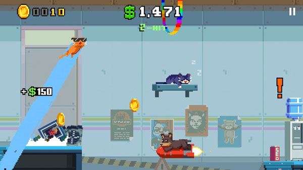 你的目标是操控猫咪在房间内尽情搞破坏,从而获取金币。操作非常简单:单击屏幕让猫咪跳跃一次,快速双击则可实现二段跳。需要注意的是,猫咪最多只能连续跳跃两次,之后必须落地才能再次起跳,合理掌握节奏是通关关键。