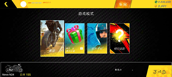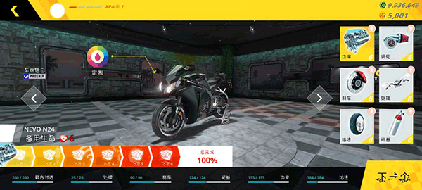 在正式出发前,先提升摩托车的性能,完成后点击“下一步”。