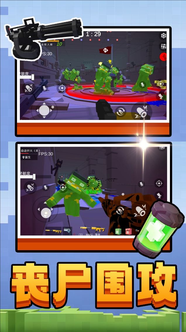 采用低多边形方块建模,打造简洁明快的战场视觉风格,兼具复古与现代射击体验。