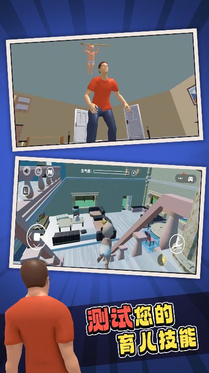 当儿子做出危险举动时,会触发夸张搞笑的动画效果,爸爸手忙脚乱的追防过程充满喜剧张力,带来轻松欢乐的游戏体验。