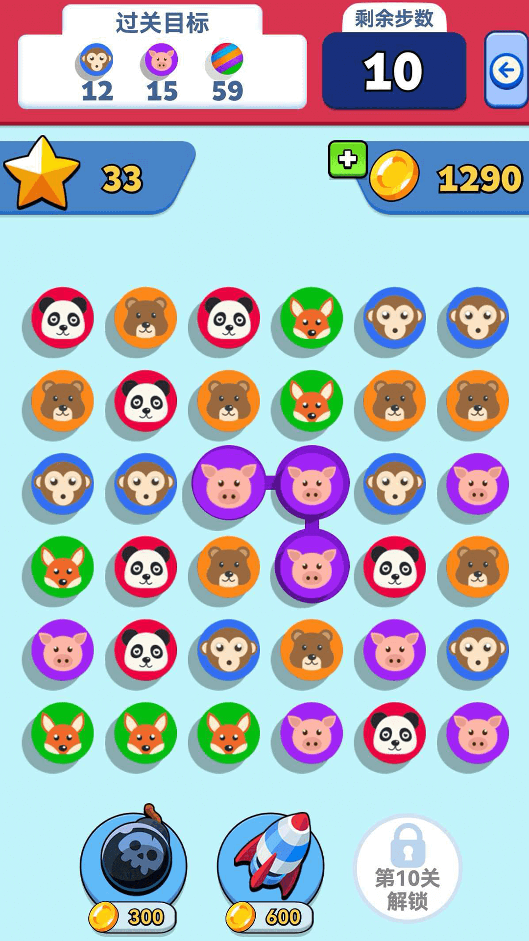 例如,将三只或更多紫色小猪徽章连成一线,系统便会自动将其消除并计入进度。