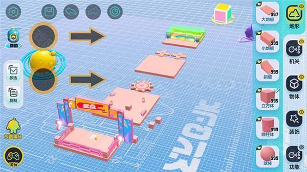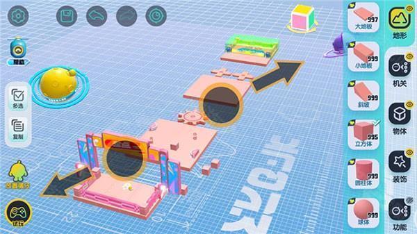 是构成关卡地图的基本组件,通过单指拖拽将地形组件放置在场景中,通过下方的操作栏,可以对选中的组件进行移动、缩放和旋转操作(默认的地形组件也同理哦),场景左边有复制按钮,以便快速复制组件。