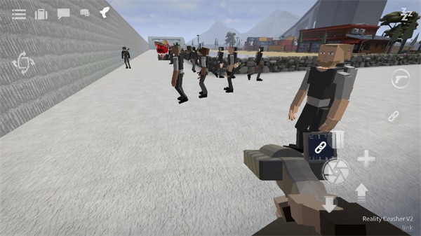 4、点击右侧“手枪”按钮切换至持枪状态,屏幕中心为瞄准与射击区域,“+”号可添加靶子或NPC角色。