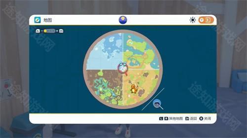按下Y键打开地图,使用ZL和ZR键缩放,右摇杆旋转视角,按下右摇杆重置方向。地图上白色叹号标记为主线任务目标,精灵球图标代表宝可梦中心,已访问过的中心会显示白色翅膀标志,选中后按A键可快速传送。