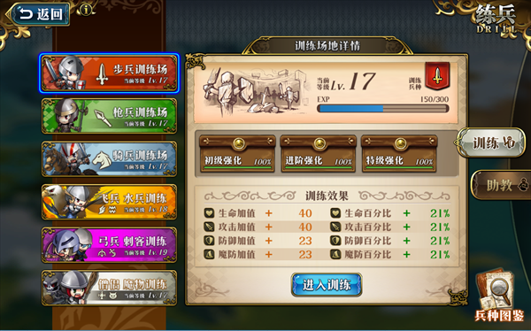 兵种分类涵盖步兵、枪兵、骑兵、飞兵、水兵、弓兵、刺客、僧侣、魔物九大类型,每类兵种均设有独立训练场;