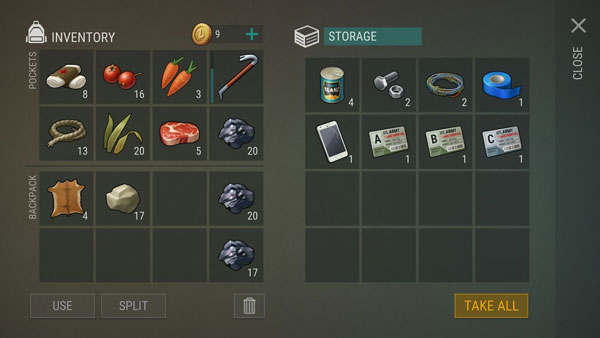 npc:衣服、武器、工具、背包、身份卡、食物、资源
