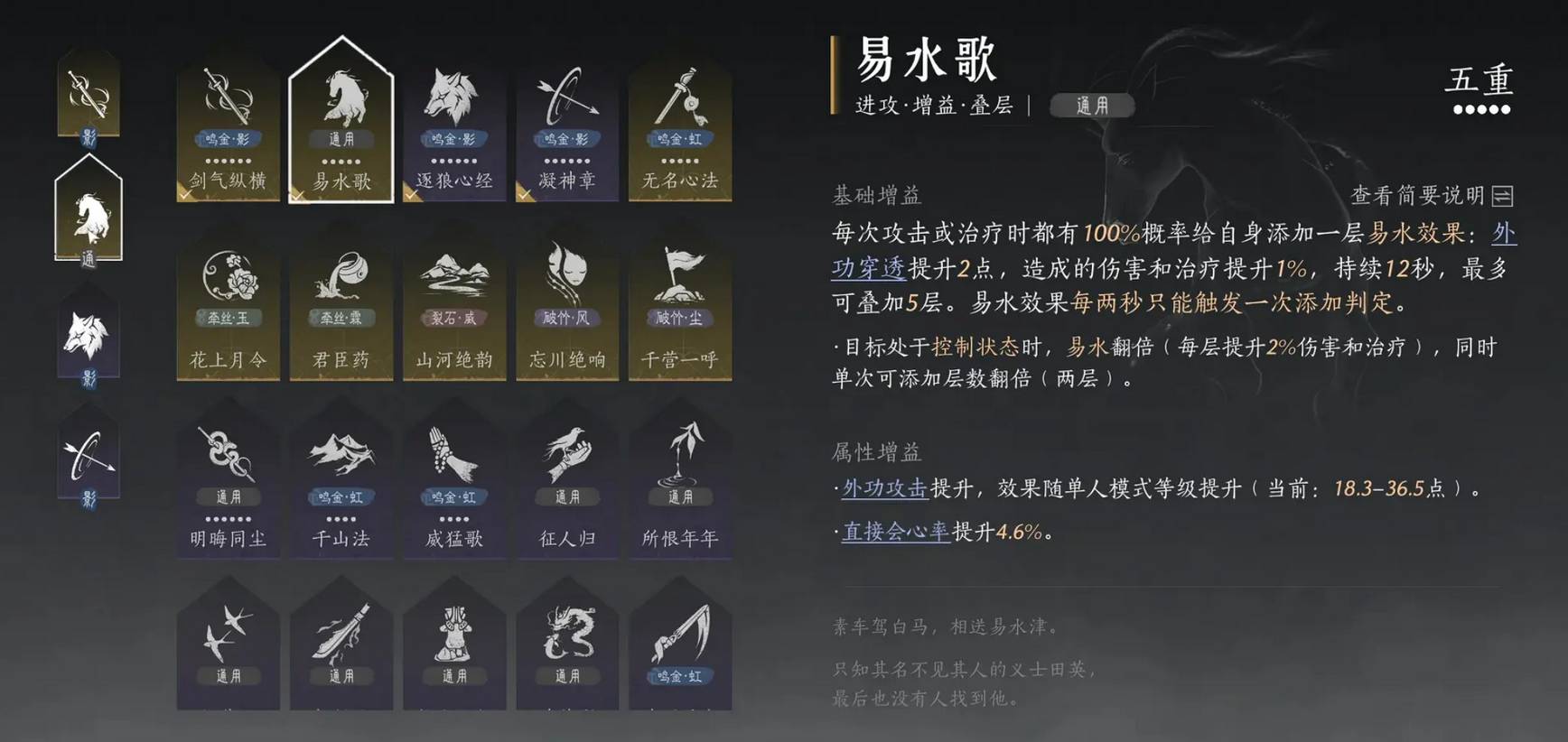 心法搭配原则:1本主修流派金色心法+1本通用金色易水歌+1本主修流派紫色心法,最后1本根据个人理解灵活配置。