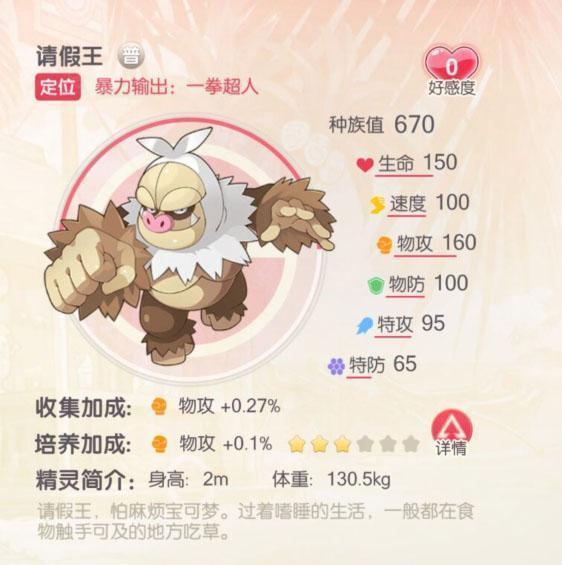 请假王拥有高达670的种族值,接近S+级别,实力毋庸置疑。小技能可提升物防并回血,使其具备一定坦度;必杀技造成600%物理伤害并无视目标30%物防,点杀能力极强,虽附带一回合睡眠,仍稳居单体输出榜首。