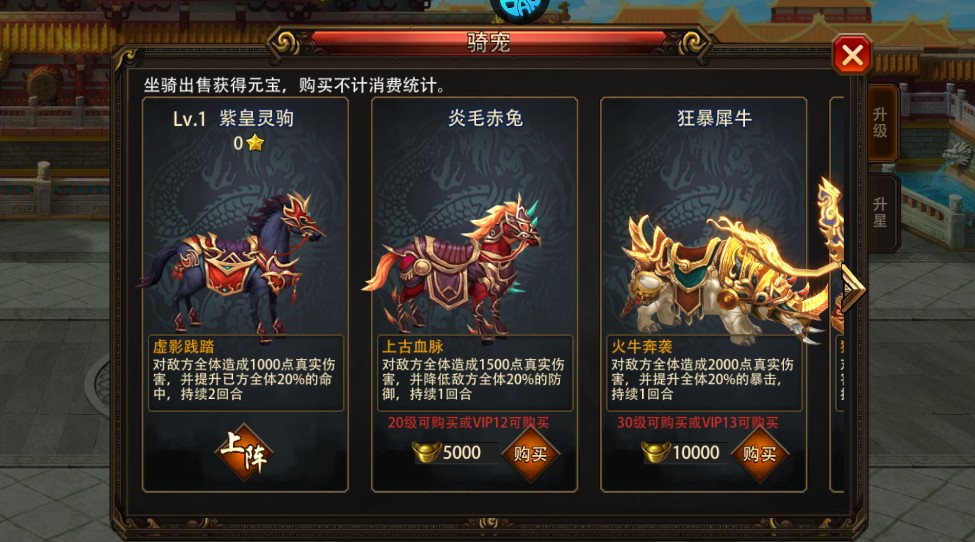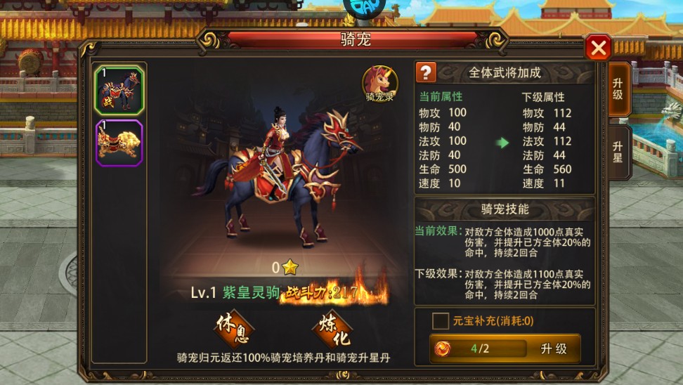 3、培养骑宠能给全体武将带来更多的属性加成,培养骑宠包括提升骑宠等级和星级。