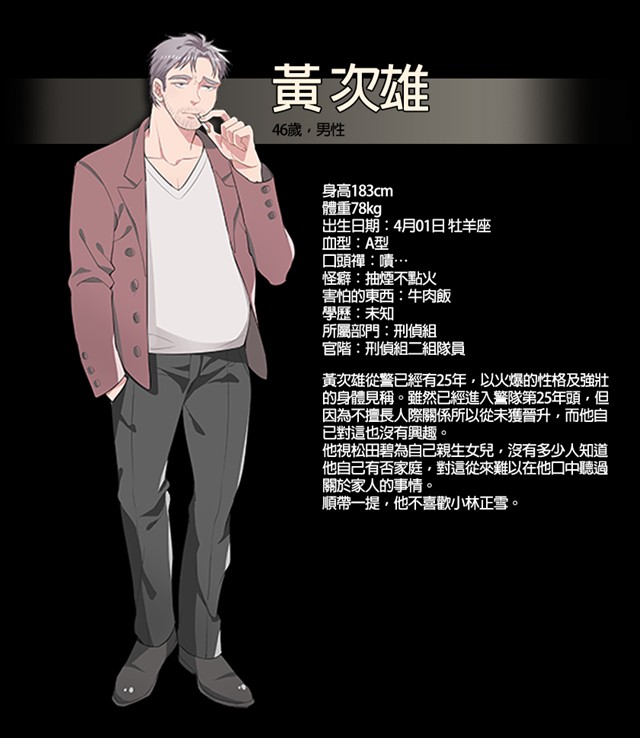 从警25年,以火爆脾气和强健体魄著称。因不善人际交往,始终未能晋升,但他对此并不在意。他将松田碧视如己出,却从未向人提及自己的家庭背景。对小林正雪抱有明显偏见,认为他不够稳重,两人关系始终紧张。