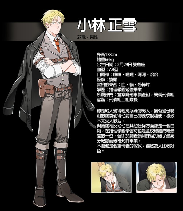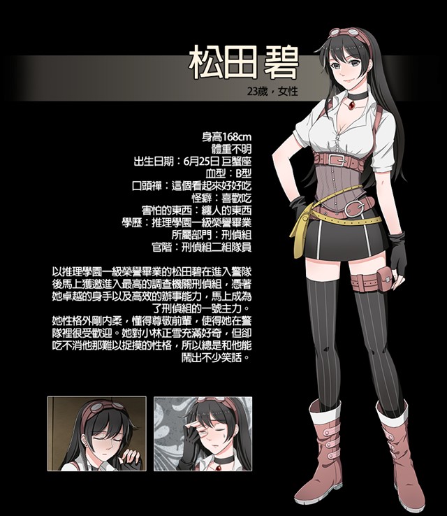 推理学园一级荣誉毕业生,刚入警队便被调入刑侦组核心部门。她身手敏捷、办事高效,性格外刚内柔,既尊重前辈又不失独立判断。在警队中人缘极佳,唯独对小林正雪那捉摸不定的性格感到头疼,两人互动时常火花四溅,笑料不断。