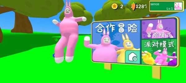 1、启动超级疯狂兔子人双人版后,主界面提供合作冒险、冒险模式和派对模式三种玩法,这里以冒险模式为例进行说明;