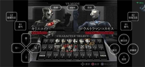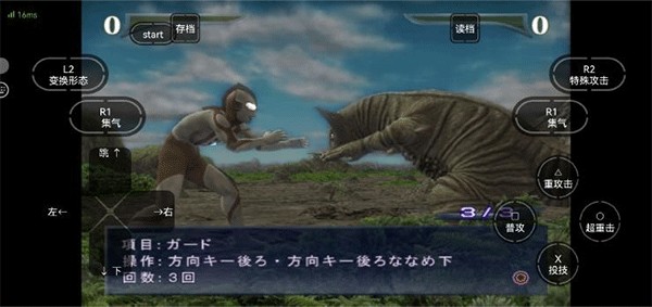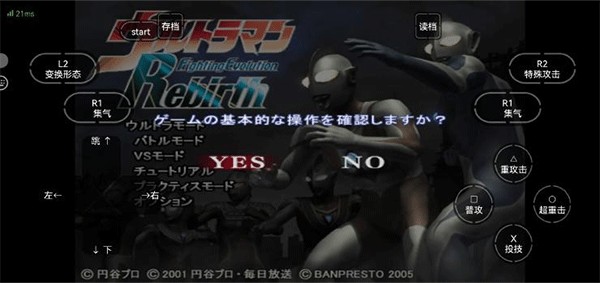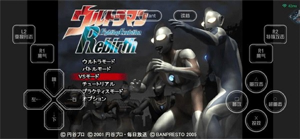 在本站下载并打开奥特曼格斗进化重生中文版后,进入游戏主菜单。由于界面为日文,我们提供中文对照图供参考:玩家可通过左侧方向键选择模式,按下右侧的【〇超重击】确认选项(默认【X投技】为取消,【O超重击】为确认)。游戏过程中可随时点击上方的【存档】和【读档】功能进行进度管理。