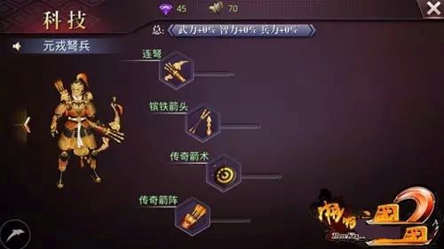 玩家需消耗特殊道具“科技锤子”对兵种进行升级。该道具可通过挑战副本、完成任务、等级奖励等多种途径获取。如图所示,兵种可从武器(提升武力)、盔甲(增加兵力)、技能(提升武力与智力)及阵型(增强对克制兵种的伤害)四个方面进行强化。