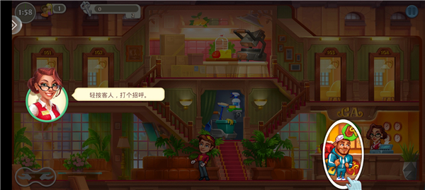 1、进入游戏首页,第一个关卡需要帮助2位客人顺利入住;