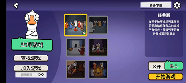 红队由两名杀手鸭组成,蓝队包含一只秃鹫和一只猎鹰。秃鹫通过吃掉被杀鹅的尸体获胜,猎鹰则拥有更快击杀速度,若清空其余玩家即可取胜。鸭子需先除掉猎鹰并消灭所有鹅才能获胜,还可使用变形能力进行伪装。