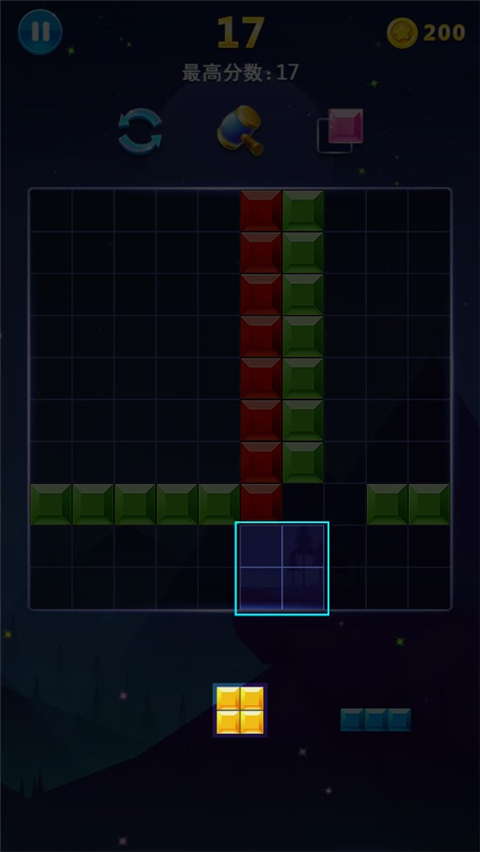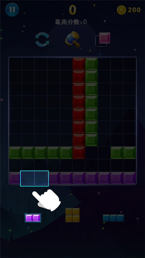 游戏操作简单直观,提供三种核心方块操作方式:坠落、拖动与消除。以拖动模式为例,只需将屏幕下方的三个备选方块拖入10×10的宫格中,当任意一行或一列被完全填满,即可触发消除,节奏流畅,上手即玩。
