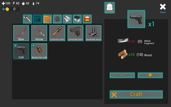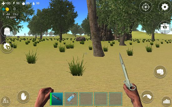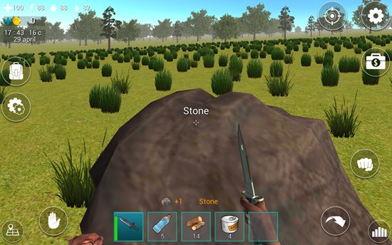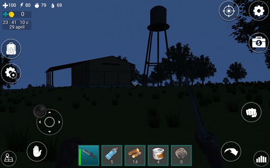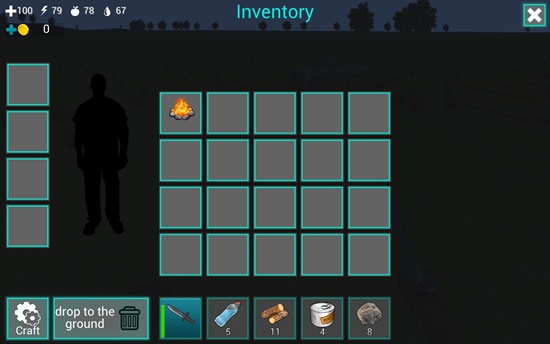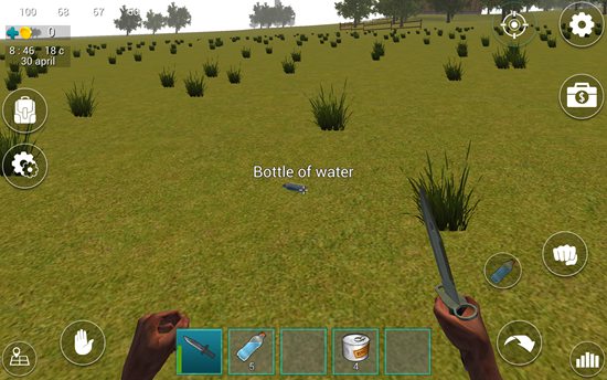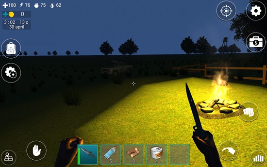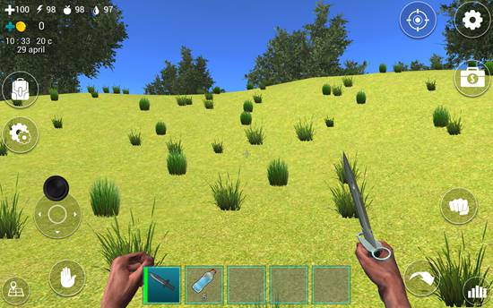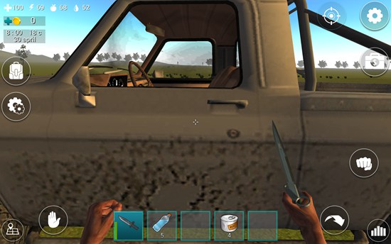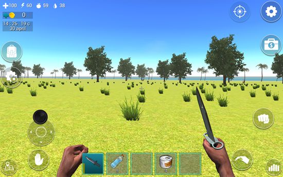 1、进入游戏后,屏幕下方道具栏中已配备一把匕首,点击即可装备。左上角显示四个关键状态:血量、体力、饥饿值和口渴值,需时刻关注。