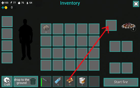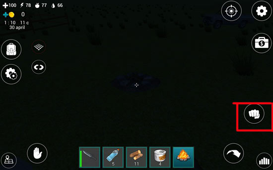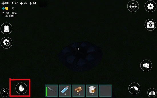 14、选中道具栏中的火堆,将其放置于合适位置后,点击右侧“拳头”按钮完成安放。