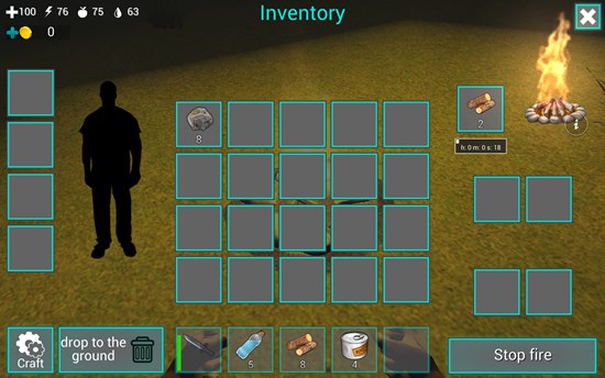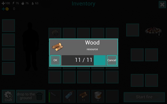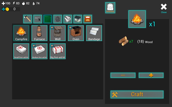 12、当前首要任务是制作火堆。合成一个火堆需7个木材,选中后点击右下角“Craft”即可完成制作。