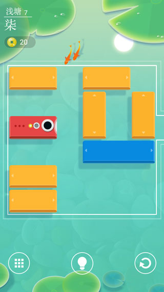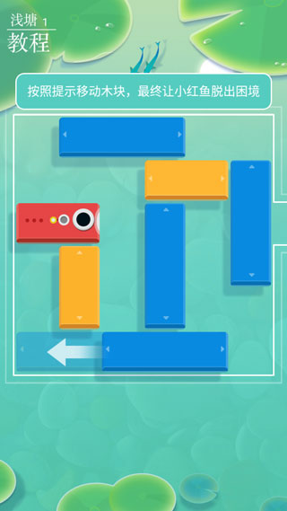 5、进入关卡后,通过上下左右滑动木块,调整布局,最终为小红鱼打通逃出水塘的通道;
