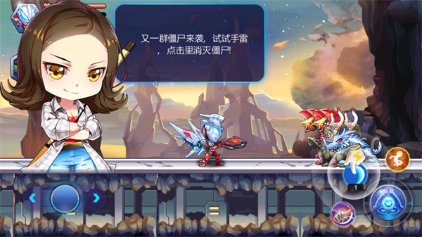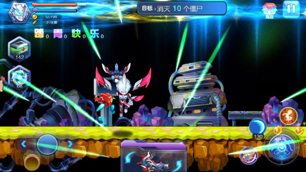 操作逻辑简洁直观:左侧控制移动,右侧集成攻击(包括近战、远程武器射击及技能释放)与跳跃功能。稍加练习即可熟练掌握。左上角设有补给道具与全屏秒杀技能,特效华丽震撼,极大提升战斗爽感。