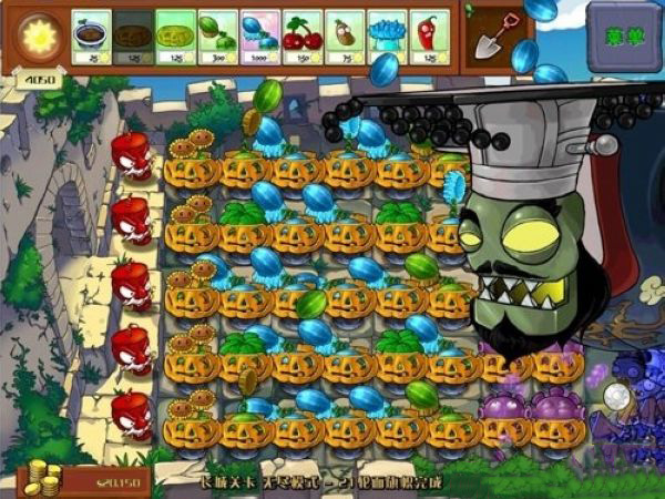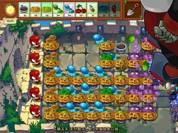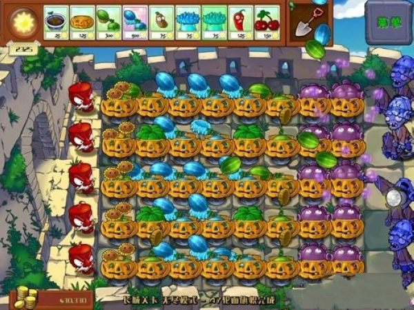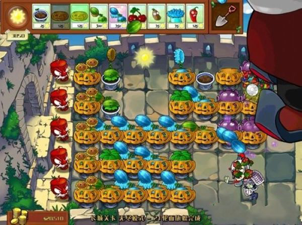 建议在第11关前完成基础阵型搭建,否则后续压力会显著增大(以下按从左至右、从上至下顺序描述):第一排布置5个向日葵,初期暂不急于升级为双头;第二排早期为向日葵与伞交替排列,后期替换为冰瓜;第三至第六排全部铺设冰瓜,第五排同样加入伞以应对空中威胁;第七、八排填满咖啡豆+大喷菇+多嘴小蘑菇+南瓜头组合;第九排切勿建造植物,以免被秦始皇出场时一脚踩毁。