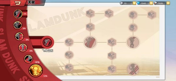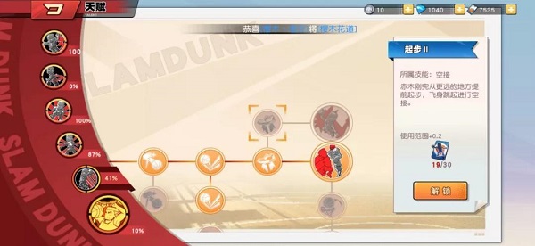 3、不同玩家的操作习惯决定了天赋解锁的优先级。以樱木花道为例,其技能包括:飞人(大招)、飞身篮板、庶民上篮、超级加速、哼哼防守和扑球。