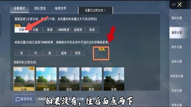 10、进入“画面设置”,选择“流畅”模式,再点击“当前”即可完成配置。