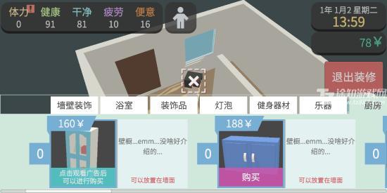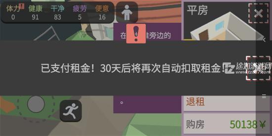 8、攒够1000元后返回出生点,走到指定位置点击“离开”,忽略路边的老太太。两间房屋中仅有一间可租,点击“租房”即可签约一个月。入住后你会发现屋内已有基础家具,标志着游戏正式进入前期发展阶段。注意:每月自动扣除1000元租金,若余额不足将被迫露宿街头(但不会结束游戏)。建议前期仍沿用上述高效赚钱法,稳定后再尝试其他收入途径。