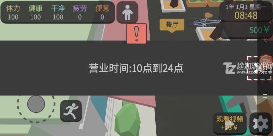 7、如厕后回到商业街,找到长椅休息10小时。醒来后再次前往餐厅吃饭(两道菜各一份,花费34元,剩余约712元),接着继续工作、吃饭、再工作(+246元)。若此前看过广告,此时总金额可达1046元,足以支付房租。若未看广告,重复上述流程即可达标。