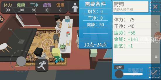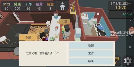 4、在餐厅内找到NPC小顾,点击她选择“工作”,推荐选择“厨师”岗位。初期只需选择最基础的工作时长,无需任何厨艺点数,性价比最高。切勿选择超市打工或街头摆摊,前者收入微薄,后者极难卖出商品。