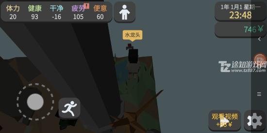 6、返回出生点,在右侧找到水龙头进行洗澡。有多少体力就用多少来洗,这能有效缓解疲劳。此时你的疲劳值和便意通常已接近满格,直接在出生点附近如厕即可。