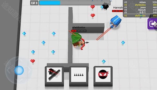 开局阶段系统会随机提供飞镖、火炮、激光、斧子或弓箭加强等初始技能。由于前期角色脆弱、输出有限,优先选择激光最为稳妥——其穿墙特性允许玩家在掩体后安全输出,大幅提升生存能力。