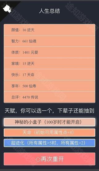 一旦幸运抽中神秘小盒子,除必须选择外,还需将体质属性点满。因修仙后期需经历渡劫考验,体质不足极易失败。此外,“克苏鲁”与“美籍华人”天赋能显著延长寿命,配合满体质可大幅提升生存几率。