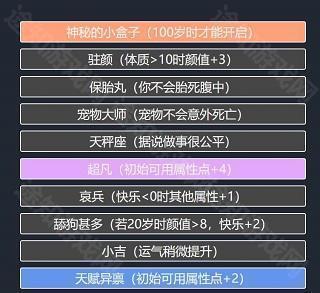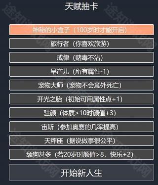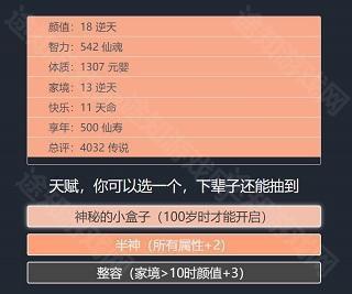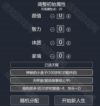 天赋选定后进入属性加点环节,初始通常为20点,部分天赋可额外增加点数。属性分为家境、体质、颜值、智力四类,每项最多加至10点。其中家境过低可能导致幼年因贫夭折,体质不足易患病早逝,颜值偏低则快乐值下降,可能引发抑郁;相比之下,智力并非关键,实测即使智力为零,仍有机会考入名校、成就非凡人生。