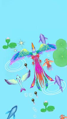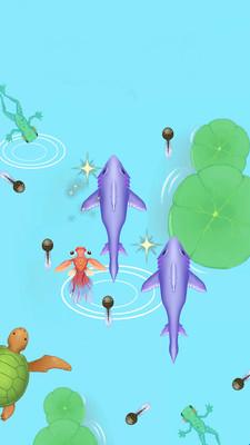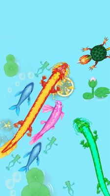 整体美术风格清新简约却不失精致,所有生物如蝌蚪、青蛙、乌龟、金鱼、鲤鱼、电鳗、小鲨鱼、大鲨鱼直至神龙,造型统一且符合逻辑,体型大小直观体现等级差异,让玩家一眼就能判断敌我强弱,增强策略性和沉浸感。