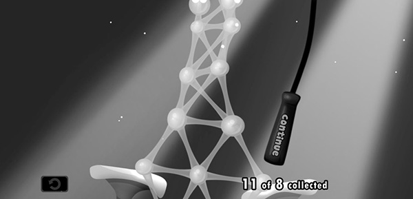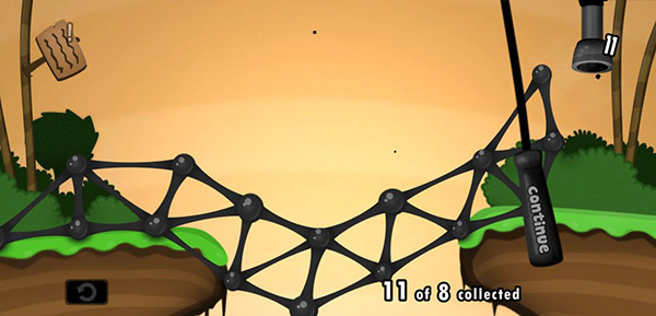 本关出现“睡觉的粘粘球”——当有活动球靠近时会被唤醒。你需要将结构延伸至悬崖对面,注意在悬崖边缘加强支撑,防止整体坍塌。