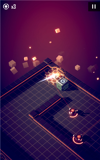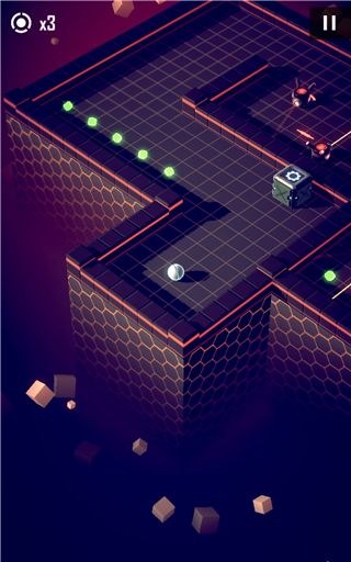4、如图所示,中间结构松散的墙体为可破坏墙,核心碰撞一次后即破碎。非加速状态下会引发反弹,而处于加速状态时则可直接穿透。墙后隐藏的是首类攻击型敌人——当其周围读条圈充满后,会瞄准小球当前位置发射单发子弹。后续还将出现三连发、散射弹、无读条加特林及多向炮台等多种变体,读条速度各异,务必仔细观察再行动。
